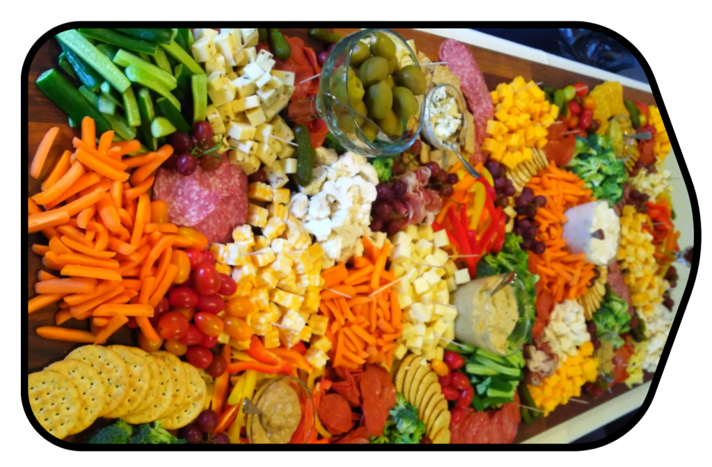 Includes a variety of meats, crackers, cheeses, sauces, vegetables, and fruit